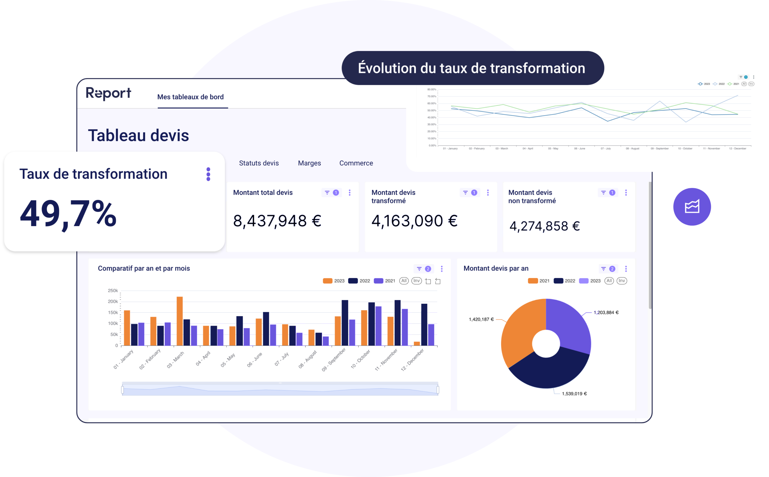 Report by Extrabat centralise vos devis, factures, commandes et marges dans des tableaux de bord clairs pour analyser votre activité, identifier vos leviers de rentabilité et piloter sans Excel.